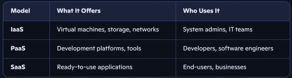Cloud computing delivers IT services over the internet, and its three main models ” IaaS, PaaS, and SaaS” offer different levels of control, flexibility, and management. Understanding these models helps individuals and businesses choose the right solution for their needs.