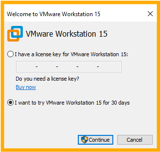 10. Open the VMware and choose if you have a license type your license key, or a trial version and click continue