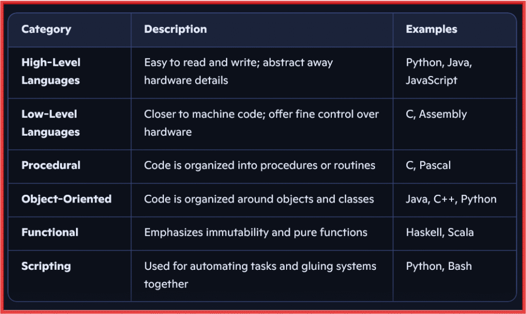 Programming languages can be categorized based on their abstraction level and paradigm: